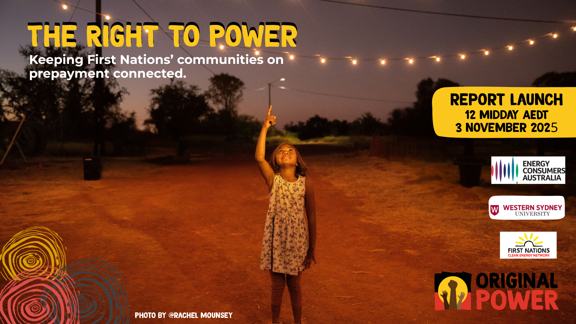 Led by an Advisory Group of First Nations’ researchers and energy sector experts, with support from Energy Consumers Australia, the report incorporates hundreds of household surveys and retailer household-level energy use data to show how frequent household disconnections are impacting food security, health, wellbeing and economic participation for First Nations’ communities, including community-led recommendations to create a fairer and more inclusive energy transition for all Australians. The launch will bring together our team of First Nations' research partners from Tangentyere Aboriginal Corporation, Nulungu Research Institute, Jabalbina Aboriginal Corporation and spokespeople from prepayment-region communities across WA, the NT, SA and Far North QLD, including: Vanessa Napaltjari Davis, Arrernte-Warlpiri, Senior Researcher, Tangentyere Aboriginal Council (Mparntwe-Alice Springs, NT) Lloyd Pigram, Yawuru-Bardi, Research Fellow at Nulungu Research Institute, University of Notre Dame (Rubibi-Broome, WA) Glen Wingfield, Arabana, South Australia Coordinator, First Nations Clean Energy Network ( Tarndanya-Adelaide, SA). Dr Tom Longden, Senior Researcher, Urban Transformations Research Centre, Western Sydney University. Karrina Nolan, Yorta Yorta, Executive Director, Original Power Dr Brendan French, CEO, Energy Consumers Australia Speakers will present evidence supporting the case for prepayment reform by Federal, State and Territory Governments, focussed on improving energy security, affordability and community resilience through six key recommendations designed to keep First Nations' communities connected to power. We look forward to you joining us online. |